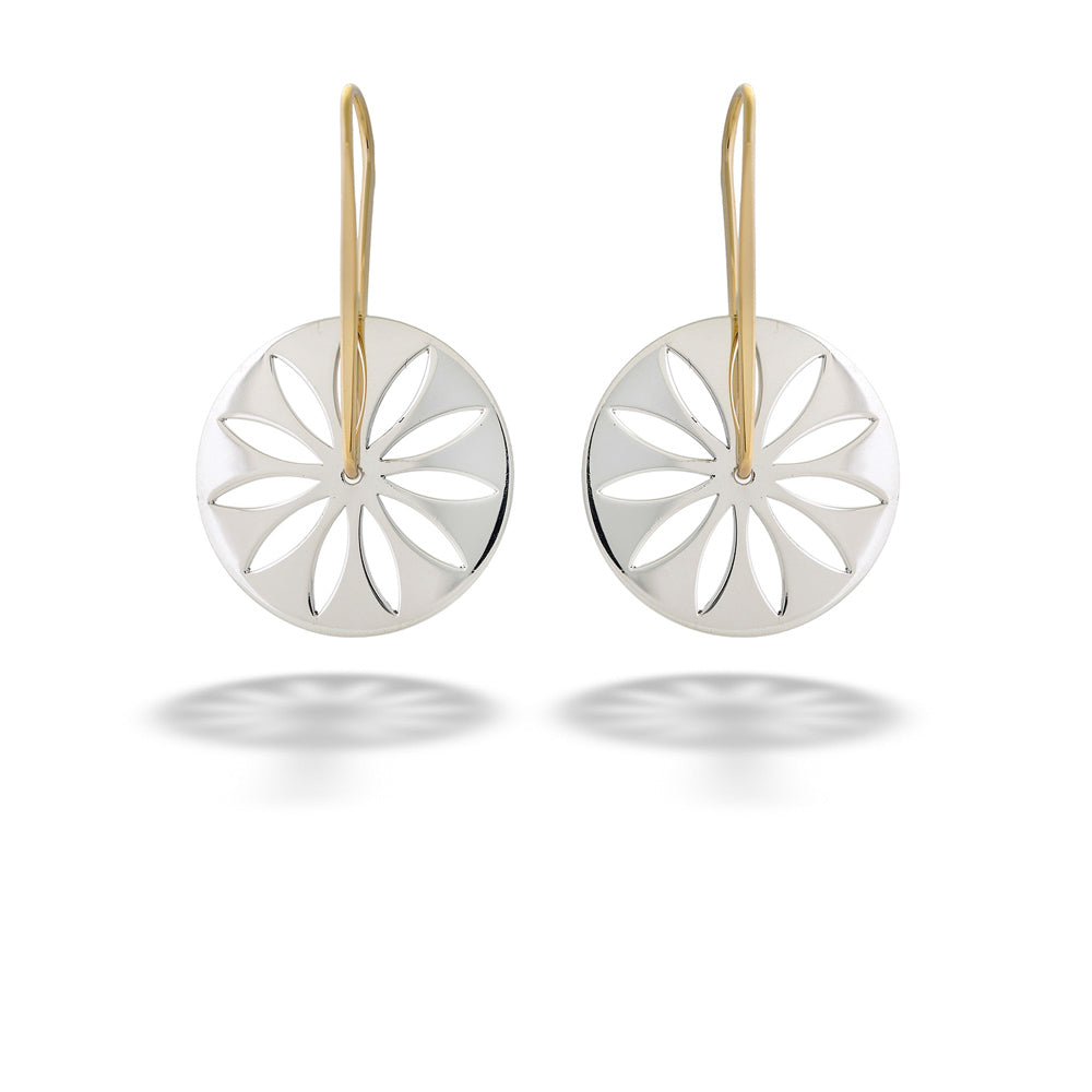These Carnival Earrings by E.L. Designs bring playful elegance to any look. The polished sterling silver discs feature a radiant cutout pattern reminiscent of a spinning carnival wheel, creating a light-catching, airy silhouette. Each disc hangs from a slender 14K yellow gold ear wire, adding a warm contrast and luxurious touch.