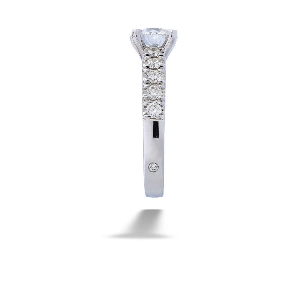 Elevated in brilliance and timeless in style, this 14K White Gold Round Diamond Engagement Ring by Valina showcases a breathtaking 1.55ct F VS1 round lab-grown diamond as its center. Securely set in a classic six-prong head, the center stone radiates exceptional fire and clarity. The polished white gold band is adorned with 0.67tdw of natural round diamonds, adding luxurious sparkle and enhancing the ring’s refined elegance.
