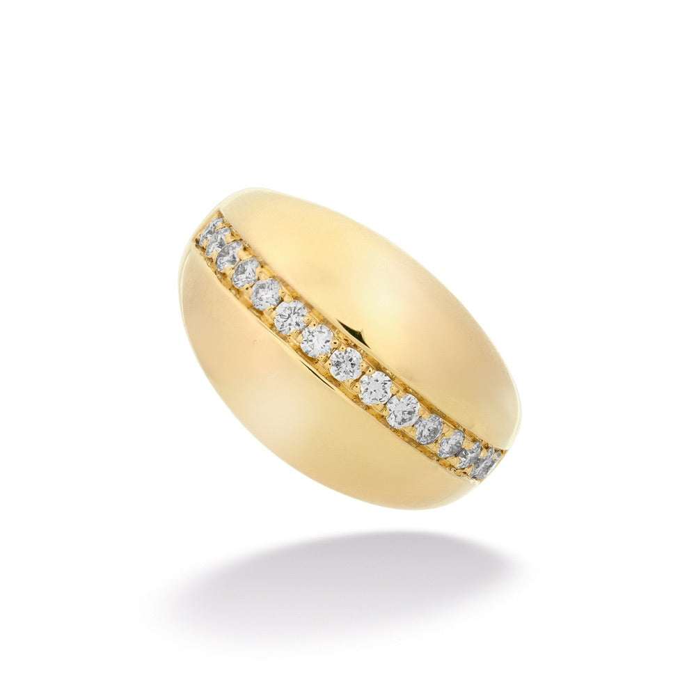 This Diamond Graduated Ring by Shy Creation is a bold expression of refined elegance. Crafted in rich 14K yellow gold, the ring features a softly rounded, high-polish profile accented by a graduated row of sparkling diamonds set seamlessly through the center. The 0.43 total carat weight of diamonds creates a striking contrast against the warm gold, adding brilliance without overwhelming the clean, sculptural design.