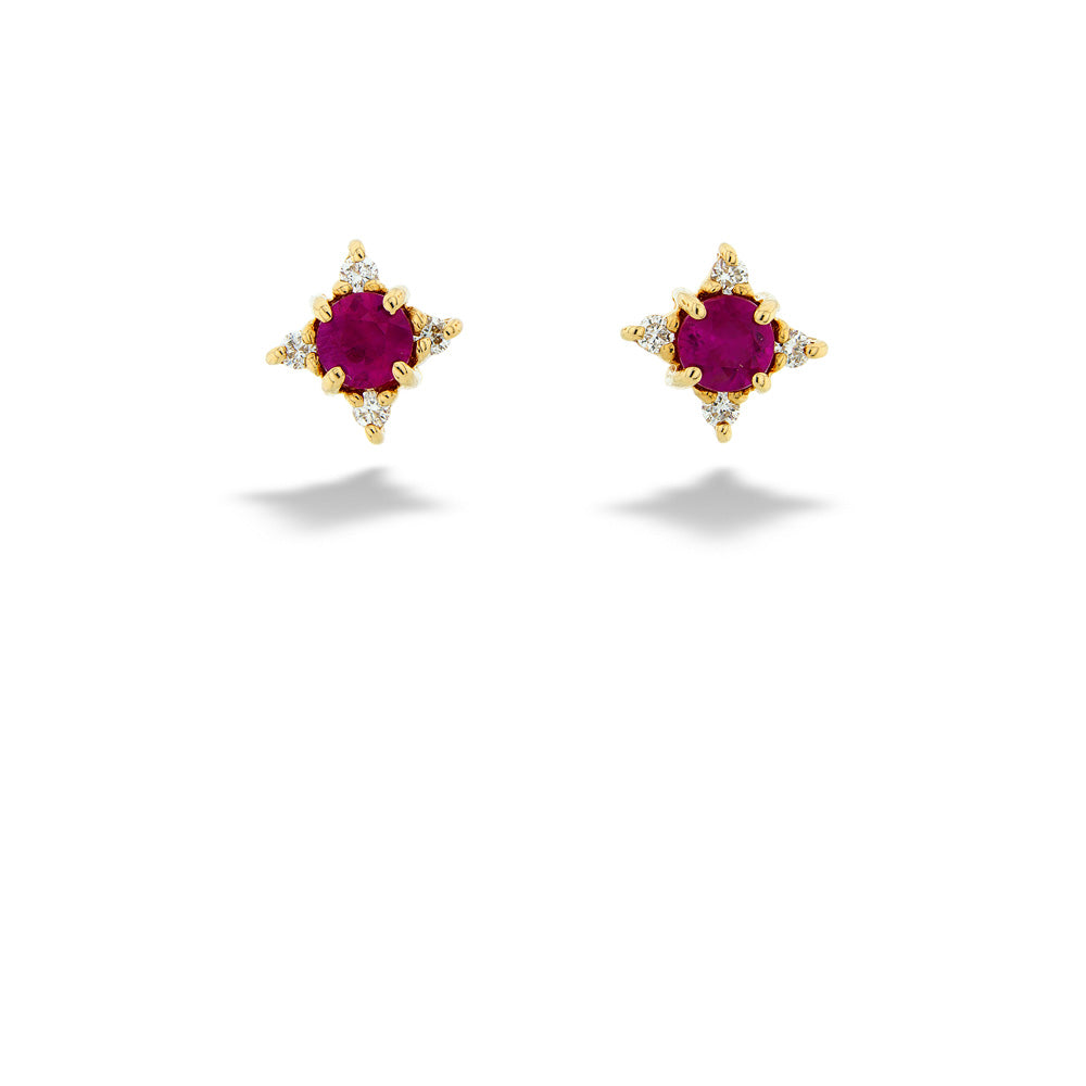 The Ruby and Diamond Stud Earrings have a star-like effect that enhances both the rubies’ rich color and the diamonds’ fire. These earrings feature vivid 3.75mm of round ruby, glowing with deep red brilliance, accented by sparkling round diamonds totaling 0.12 carats all set in warm 14K yellow gold.
