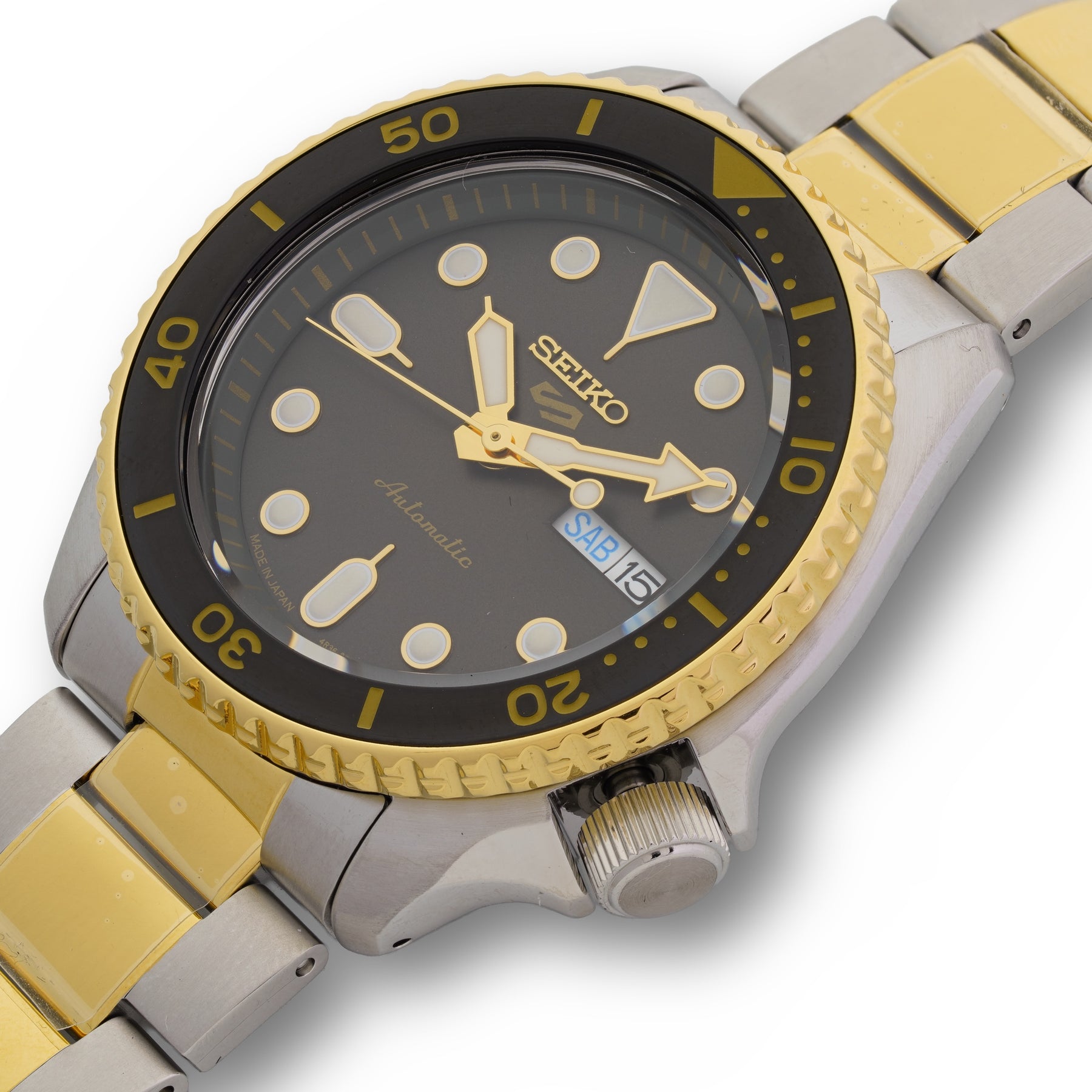 Seiko watch with gold and silver band on a white background Two-Tone 42.5mm Charcoal Dial 5 Sports Automatic Watch by Seiko