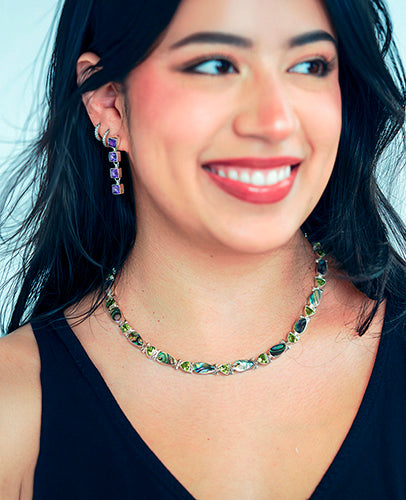 Antoinette Cleoni takes pride in assembling a collection of evocative and original designs that use a simple elegant framework to enhance the radiance of the gemstones. Acleoni’s signature look rests in the integration of handcrafted silver hinge work, silver castings, and beads with an unusual spectrum of bezel set gemstones and an array of colorful mother of pearl inlay. The result is a classic and enduring look which can be passed down from generation to generation.